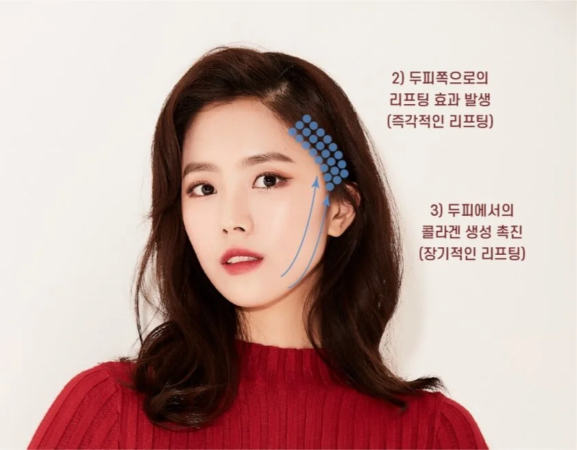약물은 공기압으로 전달되어 섬유아세포를 자극하고 콜라겐 재생을 유도하여 피부 속부터 당겨주는 효과를 볼 수 있습니다. 특히 에어젯 리프트는 바늘을 사용하지 않고 헤어라인(두피)부터 약을 주입하기 때문에 고주파, HIFU 등 다른 리프팅 시술과 병행할 수 있어 다른 시술과 병행할 경우 더욱 드라마틱한 효과를 볼 수 있다.